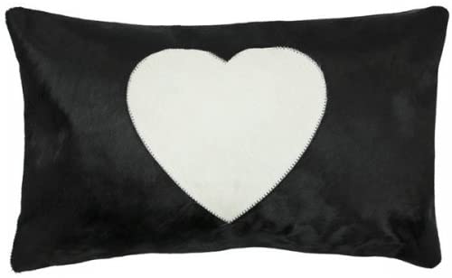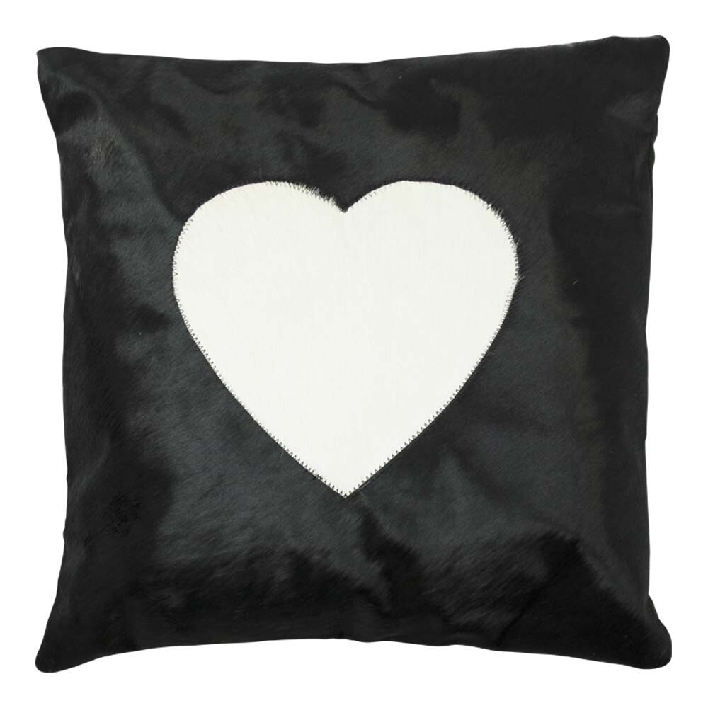 Schwarzes Kuhfell Kissen mit weißer Herz Applikation, auch aus Kuhfell. In der Größe 45x45 cm. Die Lieferung erfolgt inklusive Füllung.