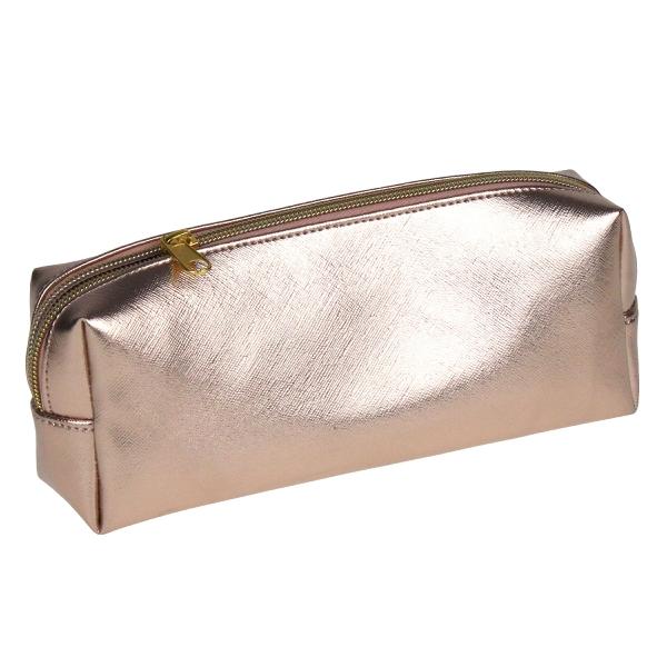 Etui in der Farbe Rosè-Gold. Verschließbar durch einen goldfarbenen Reißverschluss. Abmessungen: 21x6x10 cm.