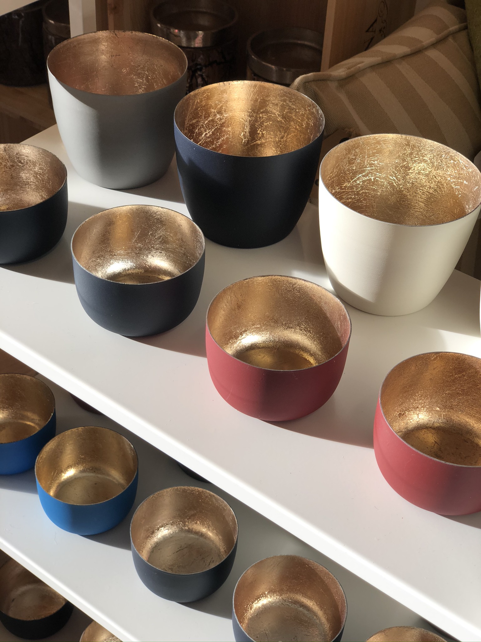 Modernes Windlicht in der Farbe matt Weiß, innen Gold. Trendiges Design. Edle Optik. Die Höhe entspricht 8,5 cm, der Durchmesser 10 cm.